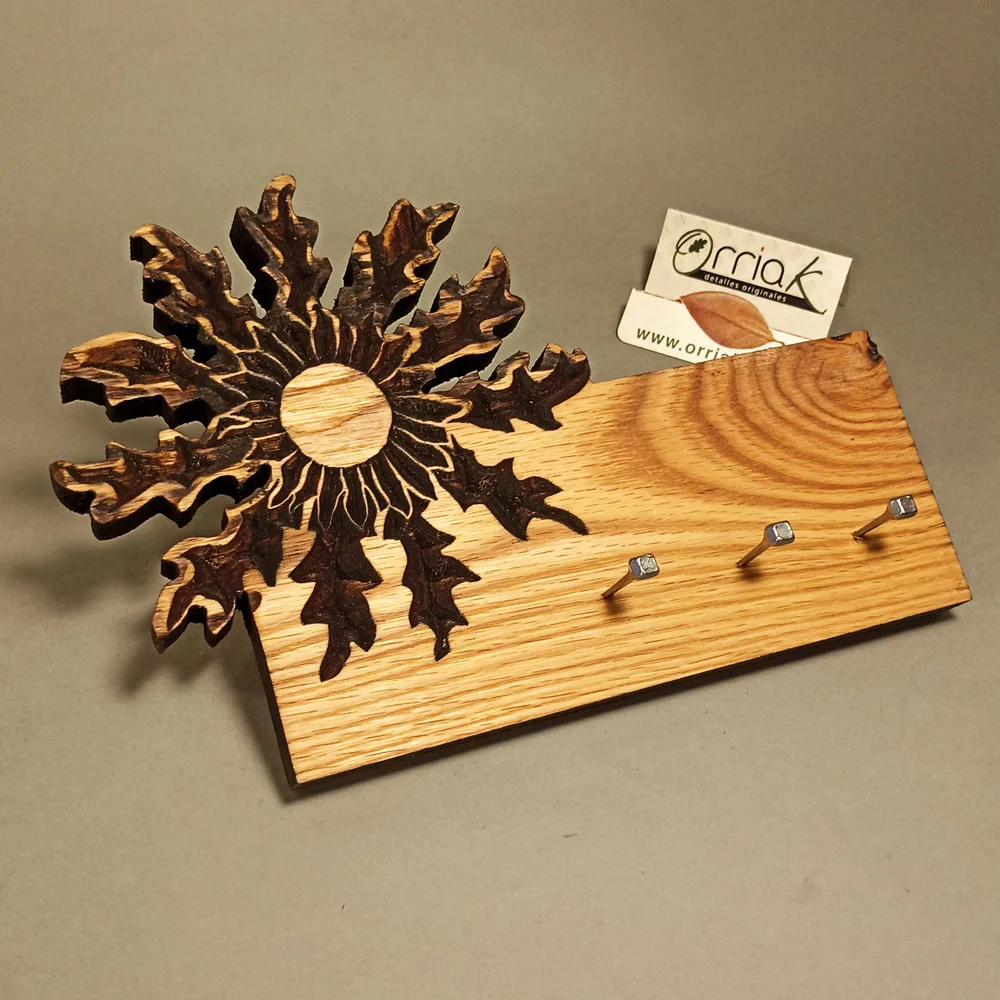 Cuelga Llaves con Eguzkilore recortado, tallado en madera de Roble con tres colgadores de acero.