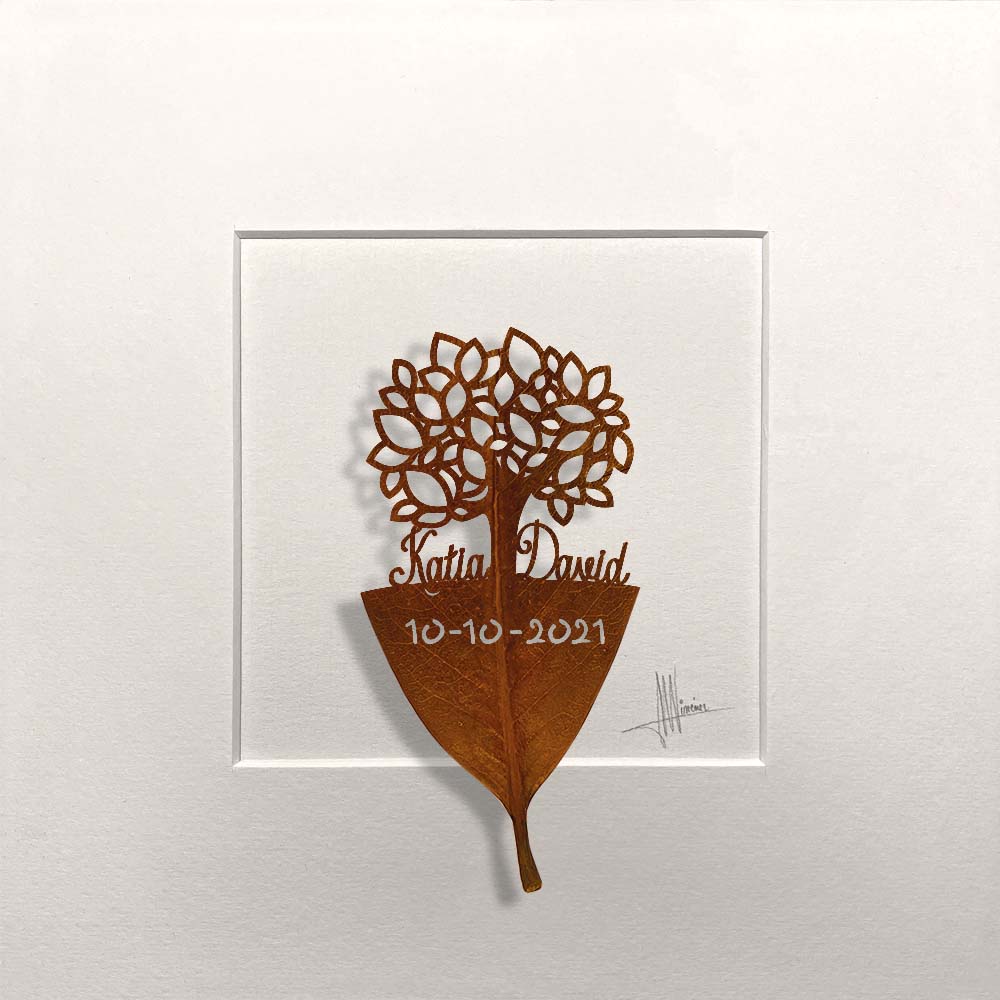 Silueta de un árbol con nombres recortada sobre una hoja natural de magnolio.