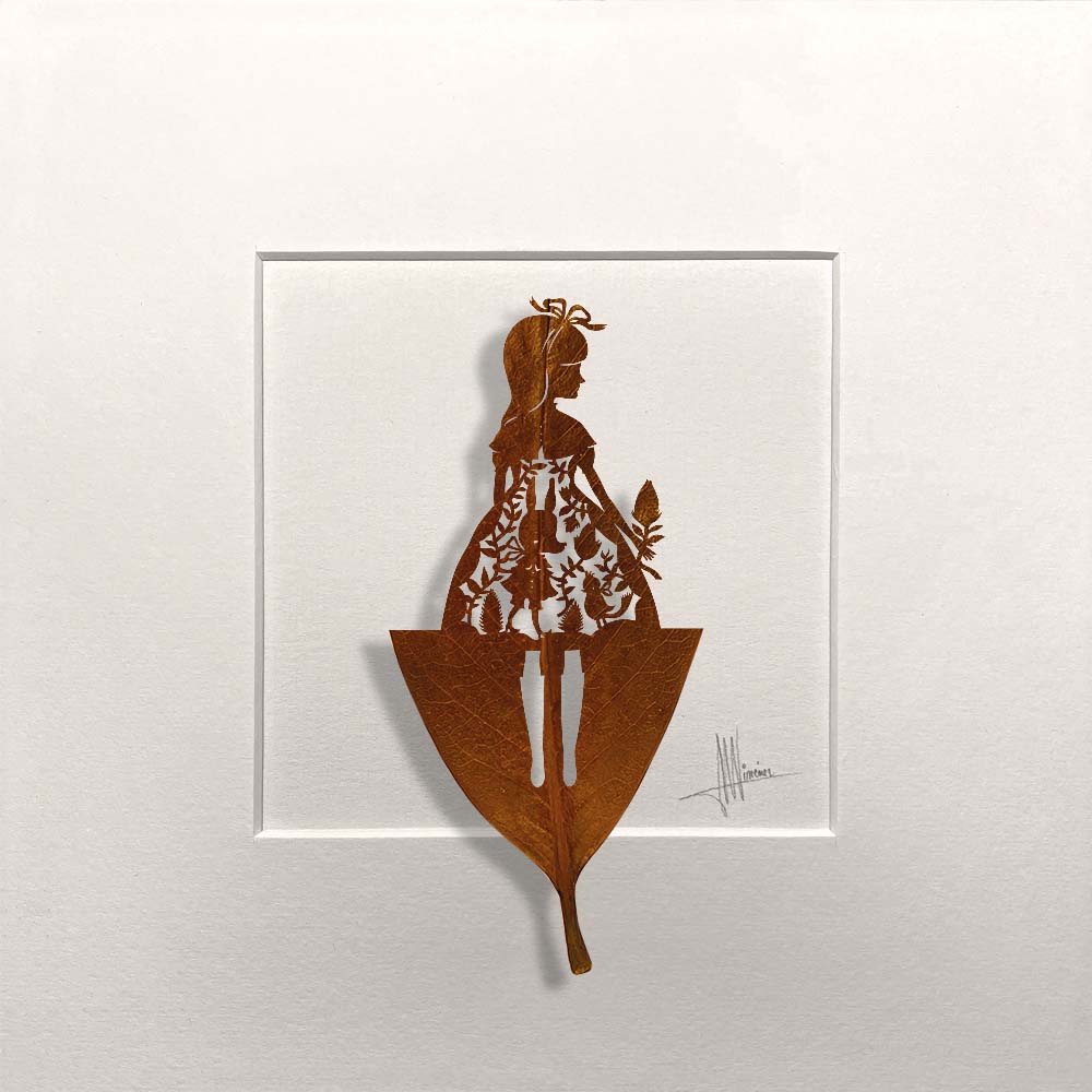 Silueta de una niña que recuerda a “Alicia en el País de las Maravillas” recortada en una hoja natural de magnolio.