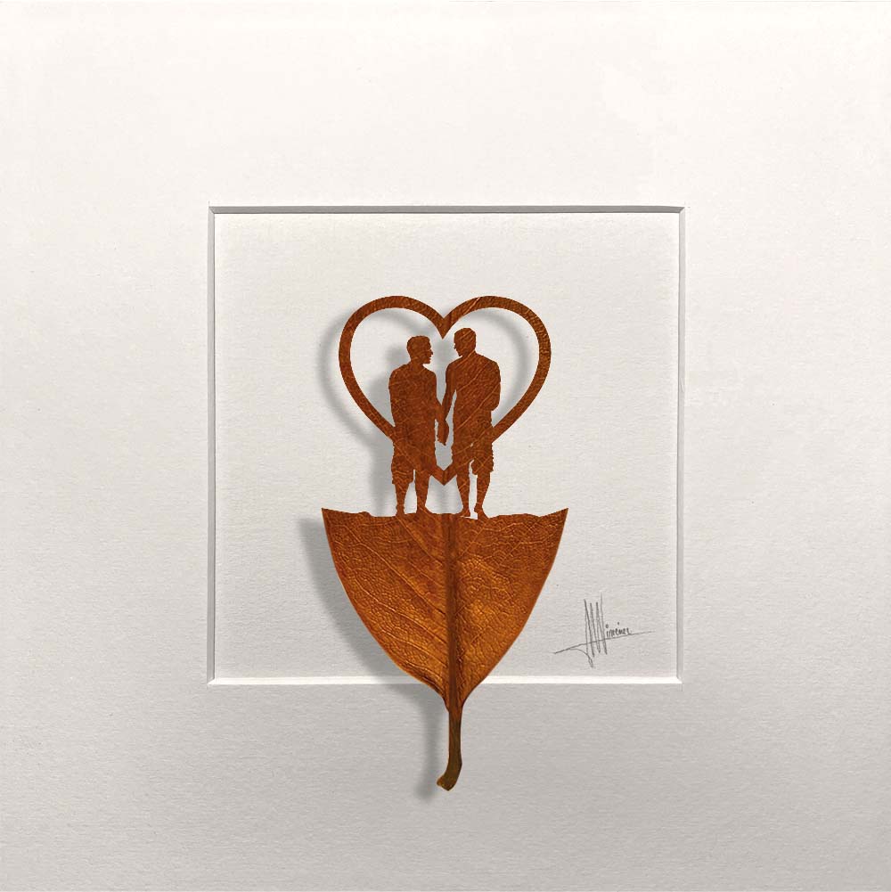 Silueta de una pareja de chicos paseando recortada sobre una hoja natural de magnolio.